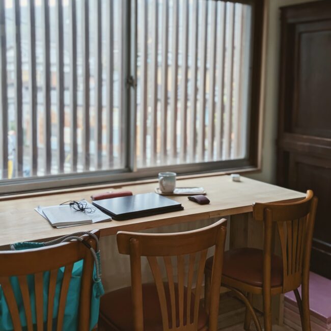 大人数の集まりやイベントも対応できる16畳の和室。ギャラリーアトリエとしてもご利用いただけます。貸切利用も可能です。おもちゃやベビーゲートも完備しているので、ママ会・パパ会は、子どもも大人もくつろげます。目の前に宝篋山が広がる眺めのいい窓際は、ワークスペースとしての利用もおすすめです。