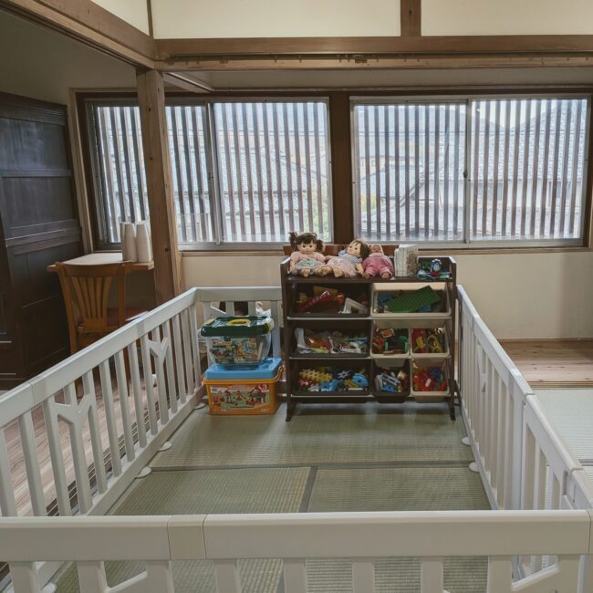 おもちゃ、ボードゲーム、知育アート、授乳室、食事イス、カームダウンすスペースなどがある10畳の和室で、赤ちゃん連れも安心です。ベビーゲートも利用いただけます。